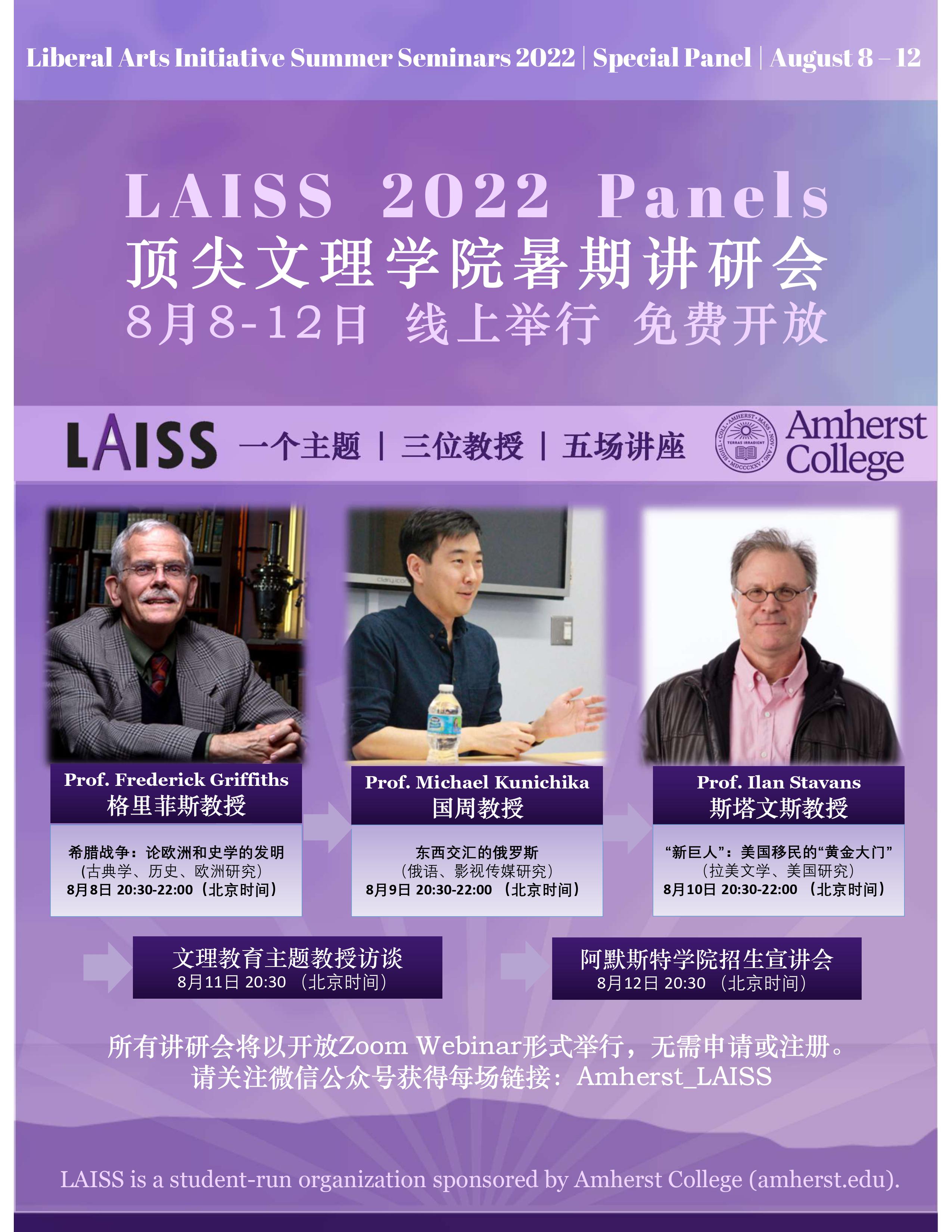 LAISS(美国顶尖文理学院暑期行动)是由美国阿默斯特学院(Amherst College)学生创办,通过阿默斯特学院官方认证,并邀请阿默斯特学院终身教授暑假授课的非营利项目。LAISS为国内的优秀学生提供不同学科的文理(博雅)教育课程以及与美国学术界顶尖教授接触的平台,还同时开设大学写作培训和大学申请信息介绍会等额外活动。LAISS的两周真实的顶尖文理学院学术体验,能让你对美国顶尖文理教育有更深刻的体验,对自身的学术兴趣和潜力有更彻底的了解,在你的留美之路上做出更多自信的选择。2022年暑期,LAISS将以讲研会形式呈现课程内容,对全体有意者免费公开,无需申请。